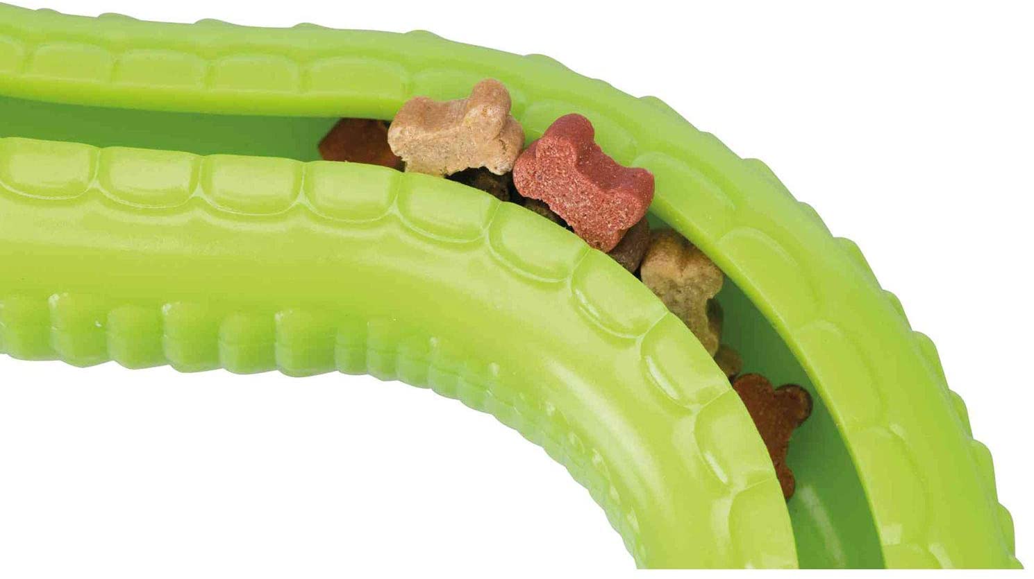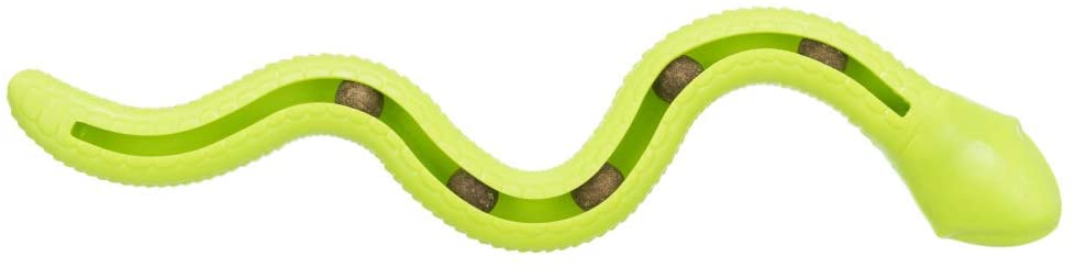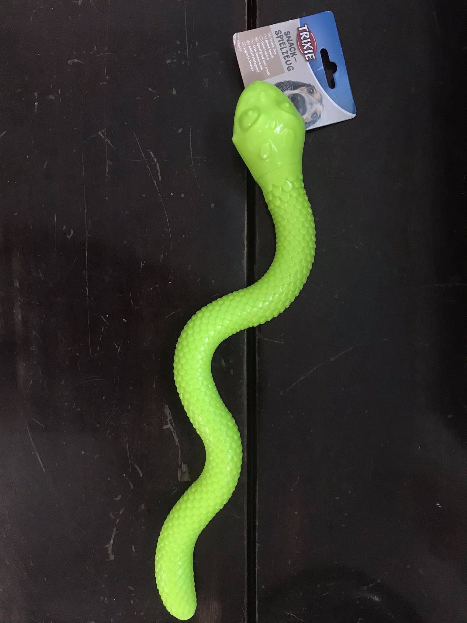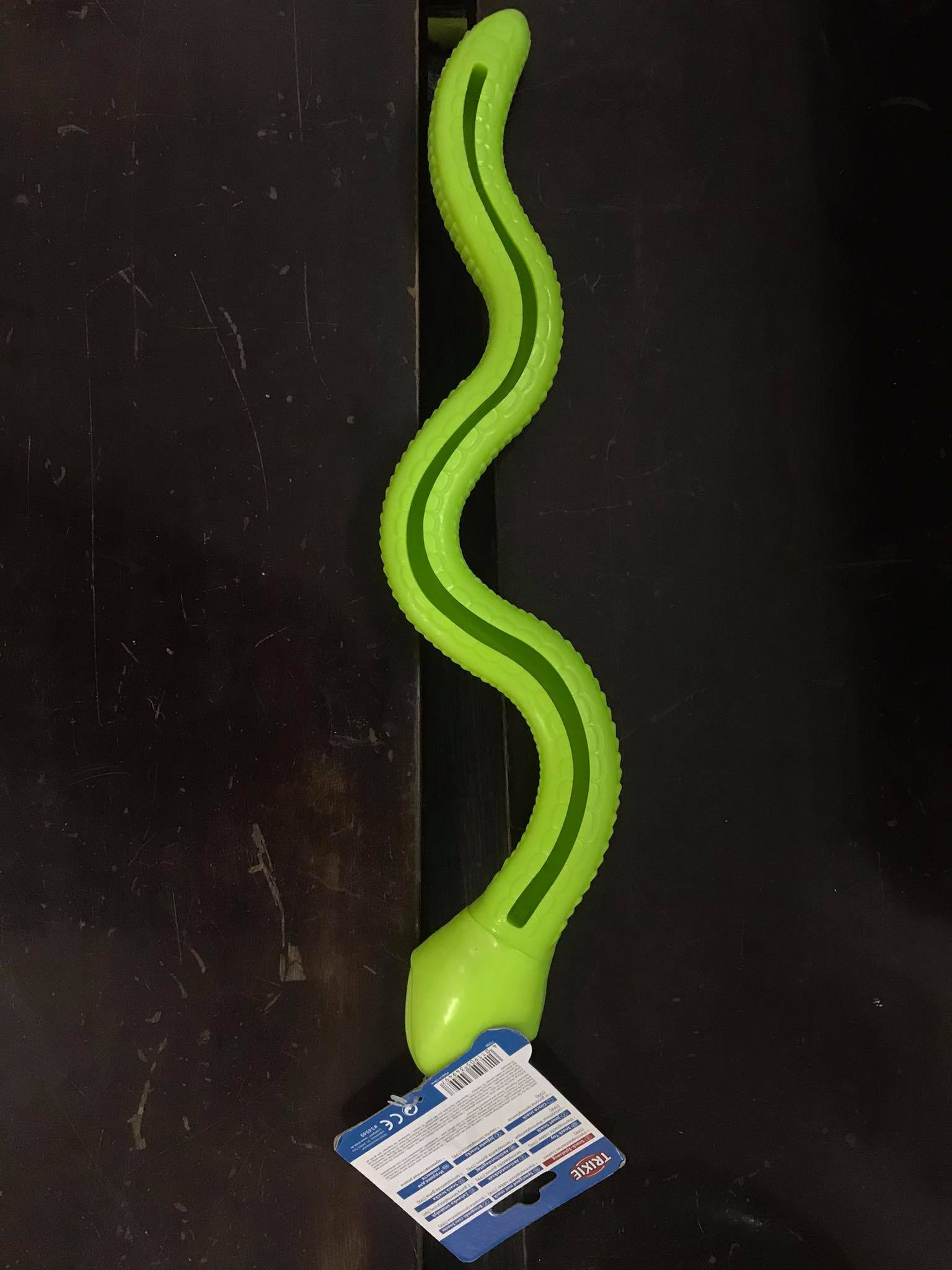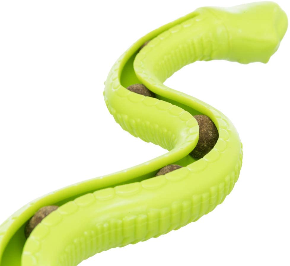 Liệu chú chó của bạn có dám đến gần món đồ chơi mới này không? Trixie Snack-Snake có hình dạng của một con rắn và có màu xanh lá cây. Mang một chút động vật kỳ lạ vào ngôi nhà của bạn. Một khi con rắn đồ chơi đã được lấp đầy bởi thức ăn, ngay cả những con chó cảnh giác nhất cũng tò mò đánh hơi món đồ chơi mới.