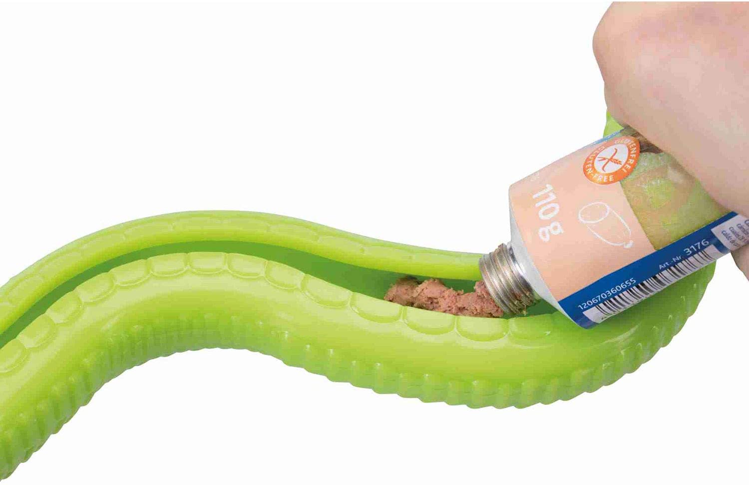 Snack-Snake có thể được mở rộng nên rất dễ dàng để lấp đầy các món ăn vặt và patê. Mặt trong nhẵn giúp bạn dễ dàng vệ sinh hơn sau khi sử dụng. Bề mặt bên ngoài có họa tiết tỉ lệ để chú chó của bạn có thể cầm nắm dễ dàng bằng răng.